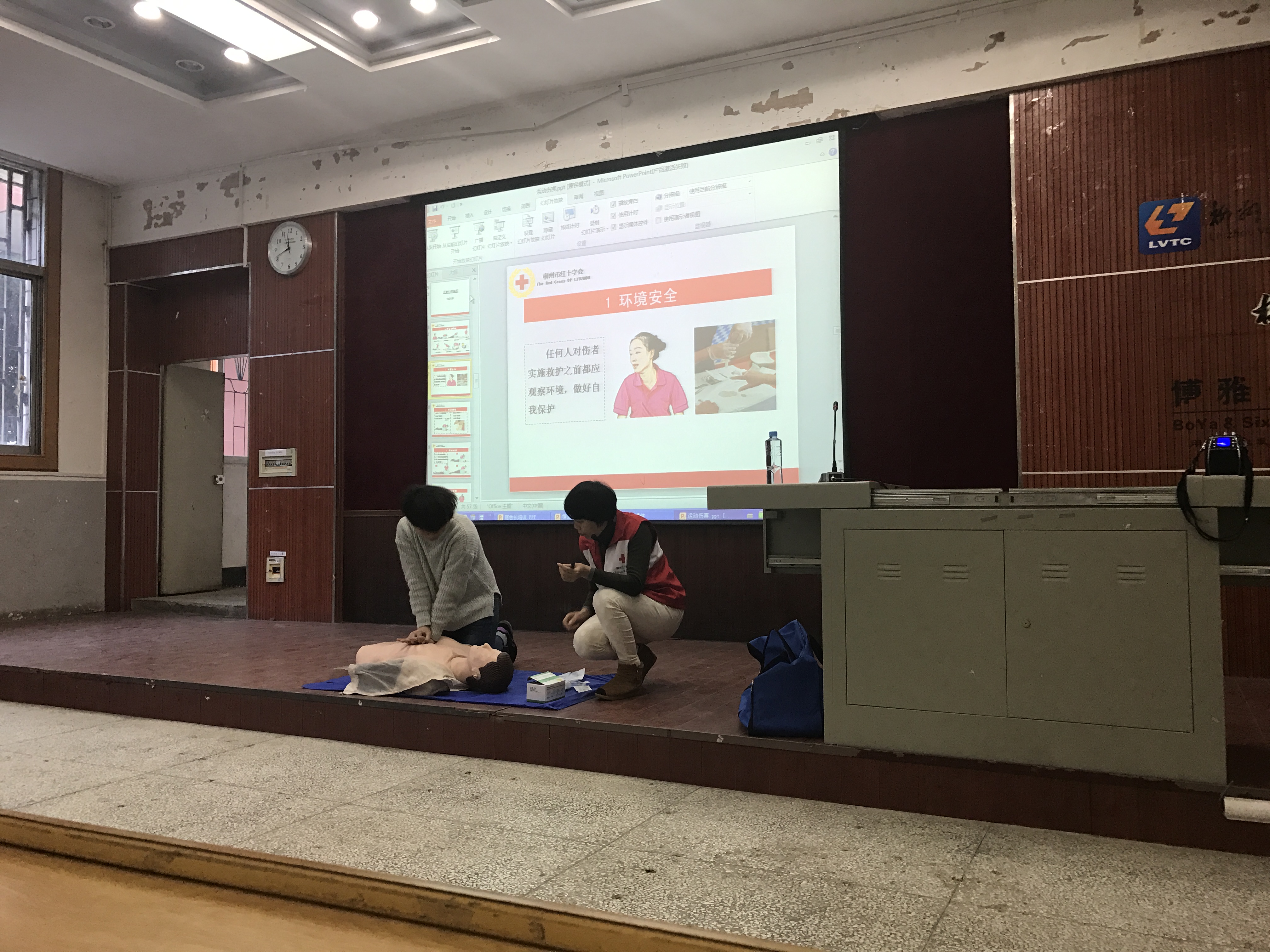 为提高舍长们在突发疾病时自救互救的能力,培训班邀请柳州市红十字会吴文娟老师给大家做应急救护培训。一个热闹的暖场游戏后,吴老师的开场白“当意外在你身边发生,现场有人受伤,在专业救援人员赶到之前,你知道如何进行正确急救吗?”吸引了同学们的注意。吴老师借助模拟人,重点讲解和演示了心肺复苏术、人工呼吸法等紧急救护技术。