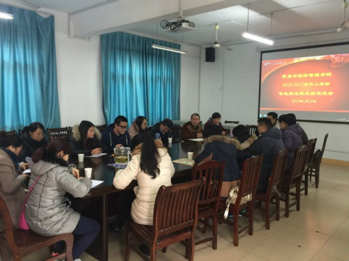新闻网消息(文/贸易与旅游管理学院 夏佩 图/贸易与旅游管理学院 朱汝群)2017年1月13日下午,贸易与旅游管理学院在达理楼303会议室召开期末专业班主任工作总结交流会,该院党总支副书记陈月明、学生科长和全体专业班主任参加会议。