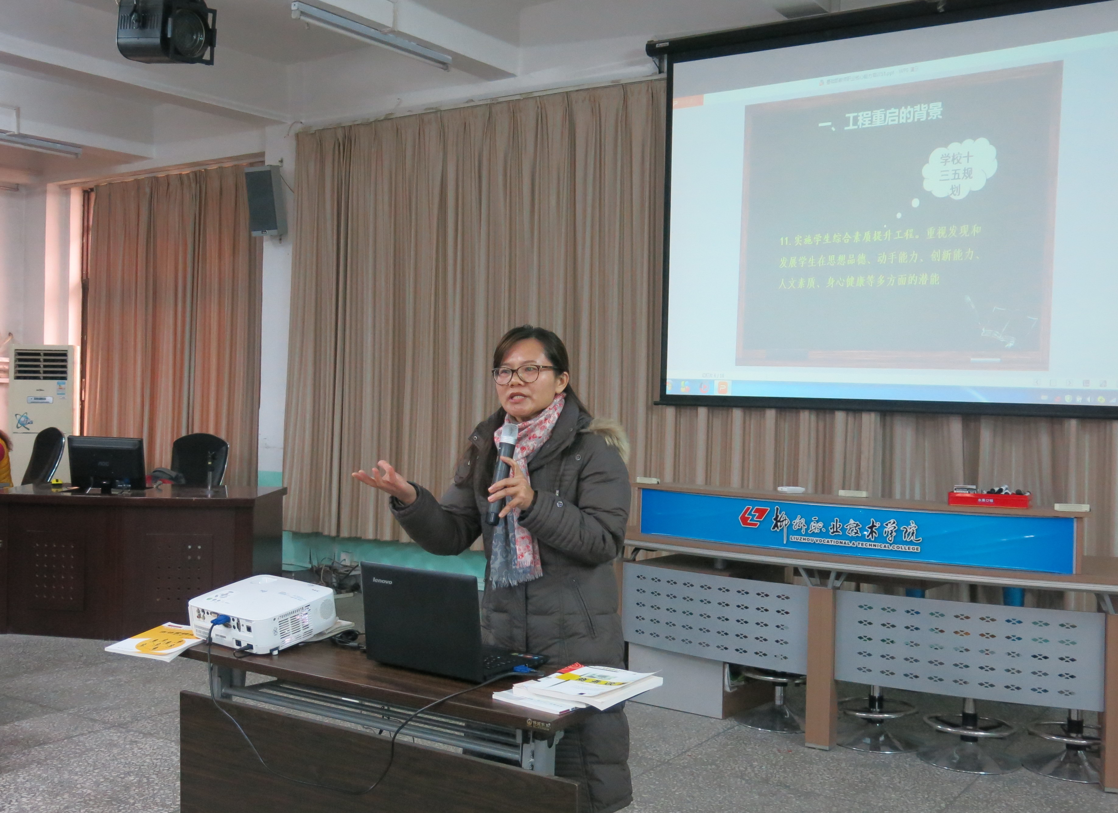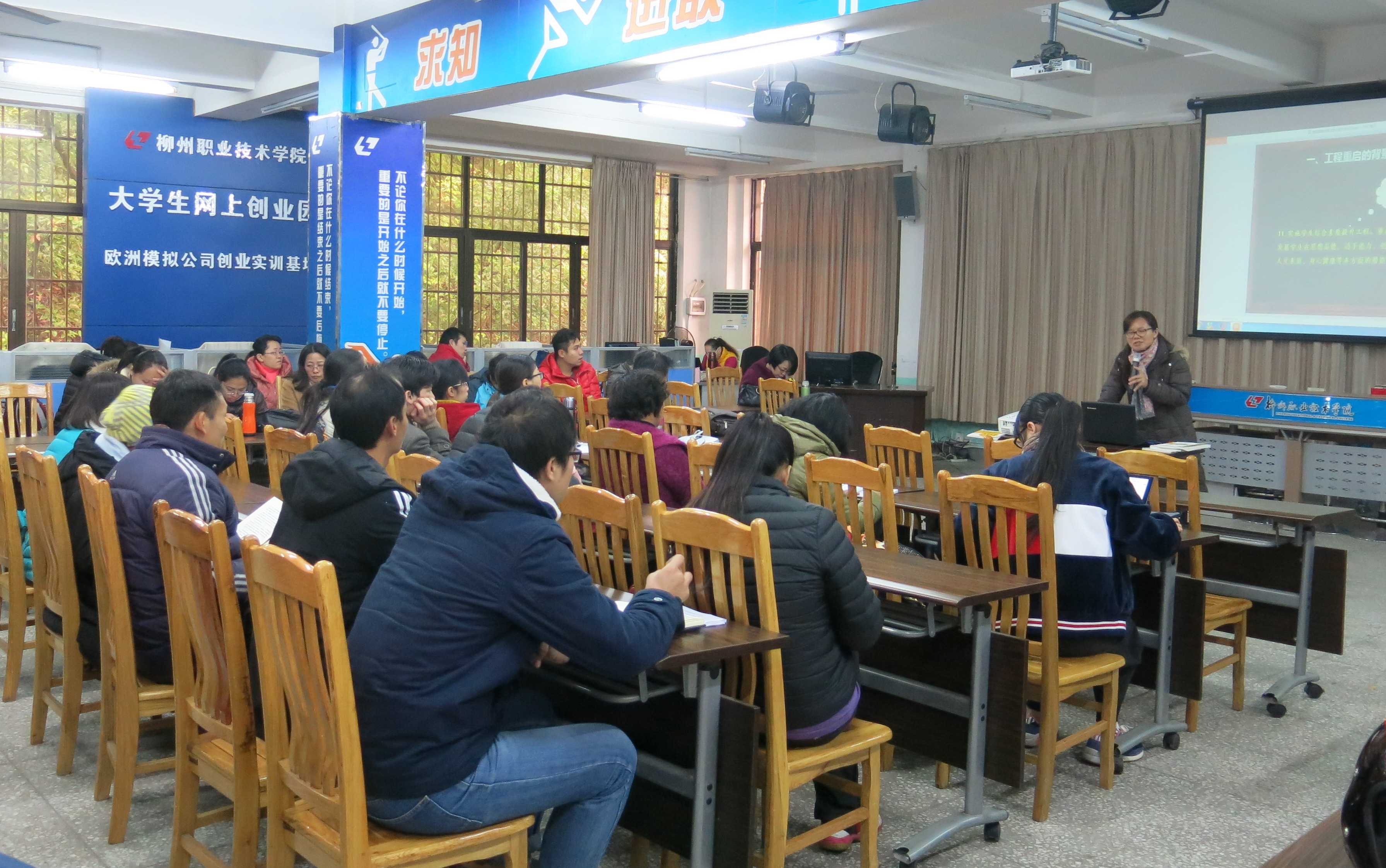 1月18日上午,该部在就业与创业实训中心实训室进行了“职业核心能力训练”“中国创新创业教育形势”“大学生SYB培训方法”三个专题的教师全员培训。该部副主任欧勇芬主讲的专题为“关于重启职业核心能力训练工程介绍”,从学生综合素质提升工程和学生终身发展需要等方面介绍了职业核心能力训练工程重启的背景,从社会能力和方法能力两个??榻樯芰酥耙岛诵哪芰ρ盗返木咛迥谌?。介绍几所兄弟院校在职业核心能力训练方面的先进经验,结合我校实际,提出了显性课程(在每门基础课程的课堂教学中开展相应??樽沤萄В┖鸵钥纬蹋ㄔ谒械诙翁?、专业课程的整个教学过程中开展渗透式教学)的课程设计理念和对教师的要求。最后,欧副主任介绍了该部实施职业核心能力训练工程的师资队伍建设推进计划,对各教学团队教师队伍承担的课程模块及学习培训工作作了布置。