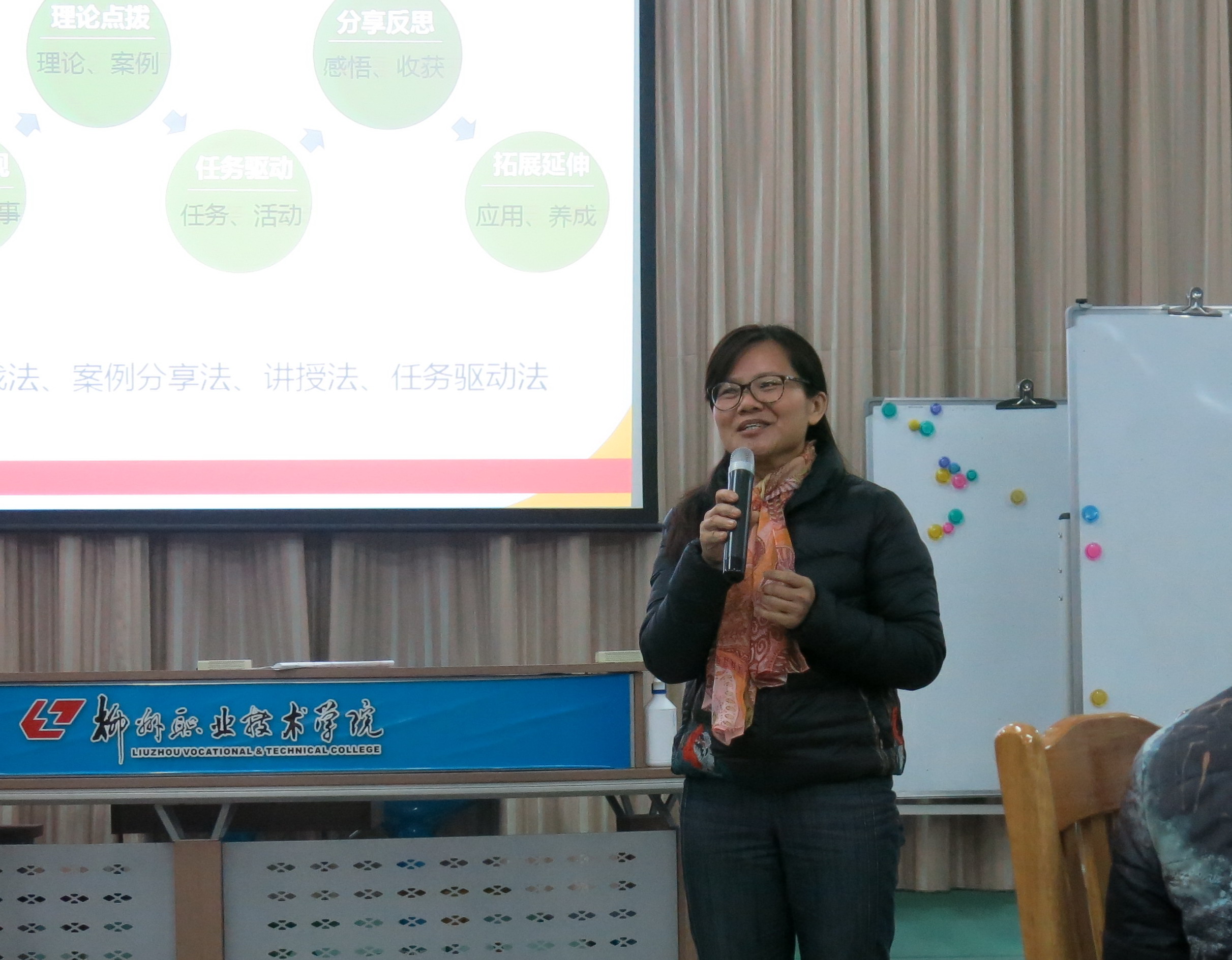 培训的专题是《职业核心能力之有效沟通》。童副教授从轻松的破冰游戏开始,运用新颖的教学设计和灵活多样的教学方法阐释了沟通的含义以及如何进行有效说服、有效沟通的方法,为在座教师归纳总结了进行学生职业核心能力训练的“五步教学法”:问题发现(游戏和故事)--理论点拨(理论案例)--任务驱动(任务、活动)--分享反思(感悟、收获)--拓展延伸(应用、养成)。童老师的讲授示范内容丰富,理论和实践相结合,运用了游戏法、案例分享、讲授法、任务驱动法等多种教学方法,教学过程体现了学中做、做中学的职业教育特点,培训现场气氛活跃,教师们参与度高,在理论聆听和实训演练中,老师们收获颇多,受益匪浅。