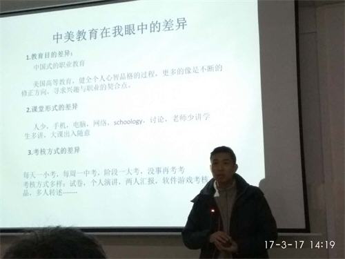 王富春老师首先介绍了赴美访学申请、前期的准备工作以及访学趣闻,并着重从教育目的、课堂形式及考核方式等三方面,向全院教职工阐述了中美高等教育的差异。王老师指出,在健全个人心智品格过程,美国高等教育更多的是在不断修正方向,寻找兴趣与职业的契合点,值得中国职业教育工作者思考与借鉴。