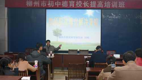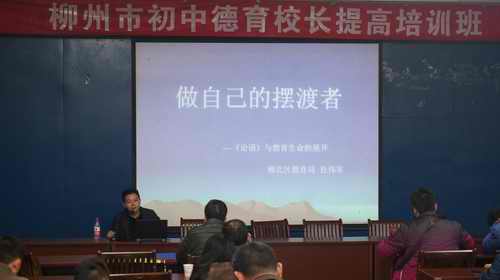 培训期间,市教育局思政科科长谢永义做了题为《坚持社会主义科学发展观,扎实推进德育工作》的讲座,介绍我市近年来在中小学社会主义核心价值观教育和德育工作中的特色经验和做法,为校长们解决德育创新难题提供有益借鉴。柳北区教育局副局长杜伟军做了题为《做自己的摆渡者--论语与教育生命的展开》的讲座,通过对论语的解读及古今教育思想的对比诠释,结合当前学生德育工作中的实际问题,引导学员们借鉴《论语》言论,从立志、改过、勤学、待人、孝敬父母等方面对学生开展教育。教科所所长刘明做了题为《教师的职业倦怠成因及对策》的讲座,从职业倦怠的特征、教师职业倦怠的成因、缓解职业倦怠的方法等方面,阐述了自己独到的观点。他建议学员们管理好自己的时间,用心对待每一个人,以平和的心态对待工作,在职业中寻找乐趣与成就。广西师范学院李红教授做的《学校德育工作的有效组织与管理》讲座,通过角色扮演、管理游戏体验等方式,让学员们领悟到学校德育管理中的“刚”与“柔”,沟通与激励是德育管理中不可缺的元素。