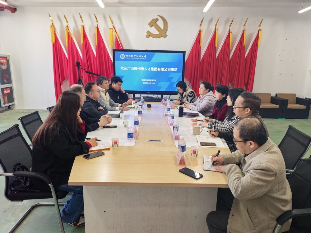 新闻网消息(文、图/ 贸易旅游管理学院  廖波光)为深化产教融合、赋能柳州产业出海与新质生产力发展,2026年3月12日,广西柳州人才集团刘琨总经理带队,率集团业务骨干曹小科经理等一行5人到访贸易与旅游管理学院,开展校企合作深度洽谈。贸易与旅游管理学院党委书记陈芳、院长杨歌谣、副院长林翔君、科研与社会服务科科长廖波光及跨境电商专业骨干教师刘轶宏、王晓娟等参加会议,双方围绕面向新质生产力企业的直播营销基地建设、跨境电商人才培养、企业出海服务赋能等核心议题展开深入交流,达成多项合作共识。