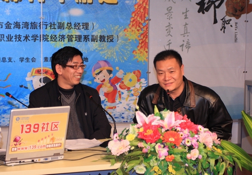 柳州市金海湾旅行社谢越强副总经理去过很多地方,他也给大家介绍了香港过圣诞的热闹气氛、北方过新年的浓浓年味以及一些少数民族地区过节的民风民俗,引起了同学们的极大兴趣。从事旅游行业的谢经理,还从经济角度谈了各类节日给旅游业带来的经济效益。