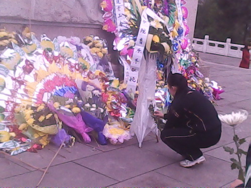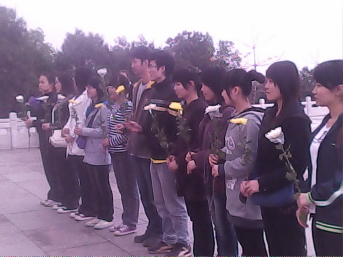 上午10时,天空下着蒙蒙细雨,同学们怀着沉重的心情,到花店买了菊花和花篮,冒雨乘公车前往烈士墓园。烈士碑高高地耸立在西山公墓的另一边山顶上,登上烈士墓的阶梯,同学们自动把手机调为震动状态,庄严地向烈士墓碑走去。