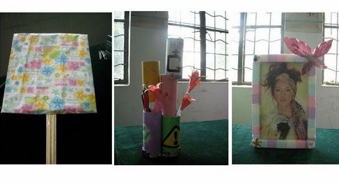 你见过用矿泉水瓶做成的花篮吗?你见过用卷筒纸筒做成的笔筒吗?2010年4月29日中午,由音乐系团总支主办的再生资源手工制作大赛在该系艺术培训中心开幕了。