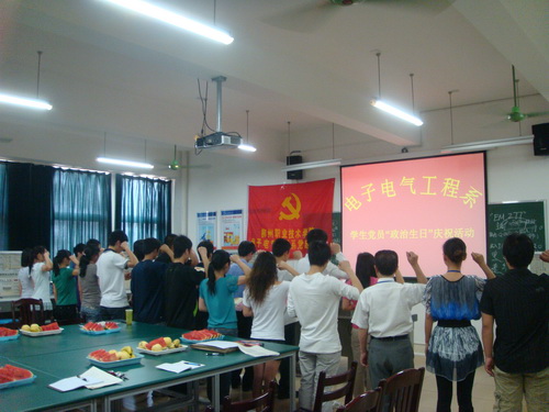 “每人都会有一个生日,而每位党员却有两个生日。一是自然生日,标志一个生命的诞生。记住它是对生命的珍视和珍重,纪念它是对赐予你生命的伟大母亲的感动和感恩;另一个是政治生日,从你入党之日起,你的政治生命就开始了,你的政治生命属于党,纪念它是对党的忠诚和信仰,是每一名党员对党的感激和感谢。”2010年5月24日电子电气工程系党总支举行了“学生党员政治生日”庆?;疃?。