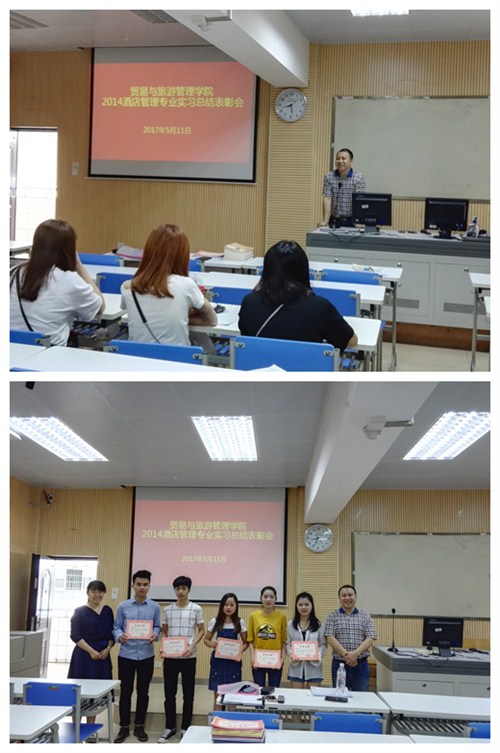 5月9日,贸易与旅游管理学院2014级酒店管理专业90名毕业生结束了为期6个月的顶岗实习顺利回校。时值学生就业的关键时期,为了让毕业生尽快找到满意的工作,学院副书记陈月明、负责就业的夏佩科长都非常重视,在学生实习结束前就主动联系好多家就业单位。2017年5月11日上午8:30在博闻楼412教室,首先对2014级酒店管理专业顶岗实习进行了简短的实习总结表彰,接着召开了两场招聘宣讲会,一场是“柳州莲花山庄”,另一场是柳州卡乐星球(华侨城),来自酒店管理专业、市场营销专业、电子商务专业等60余名毕业生参加。