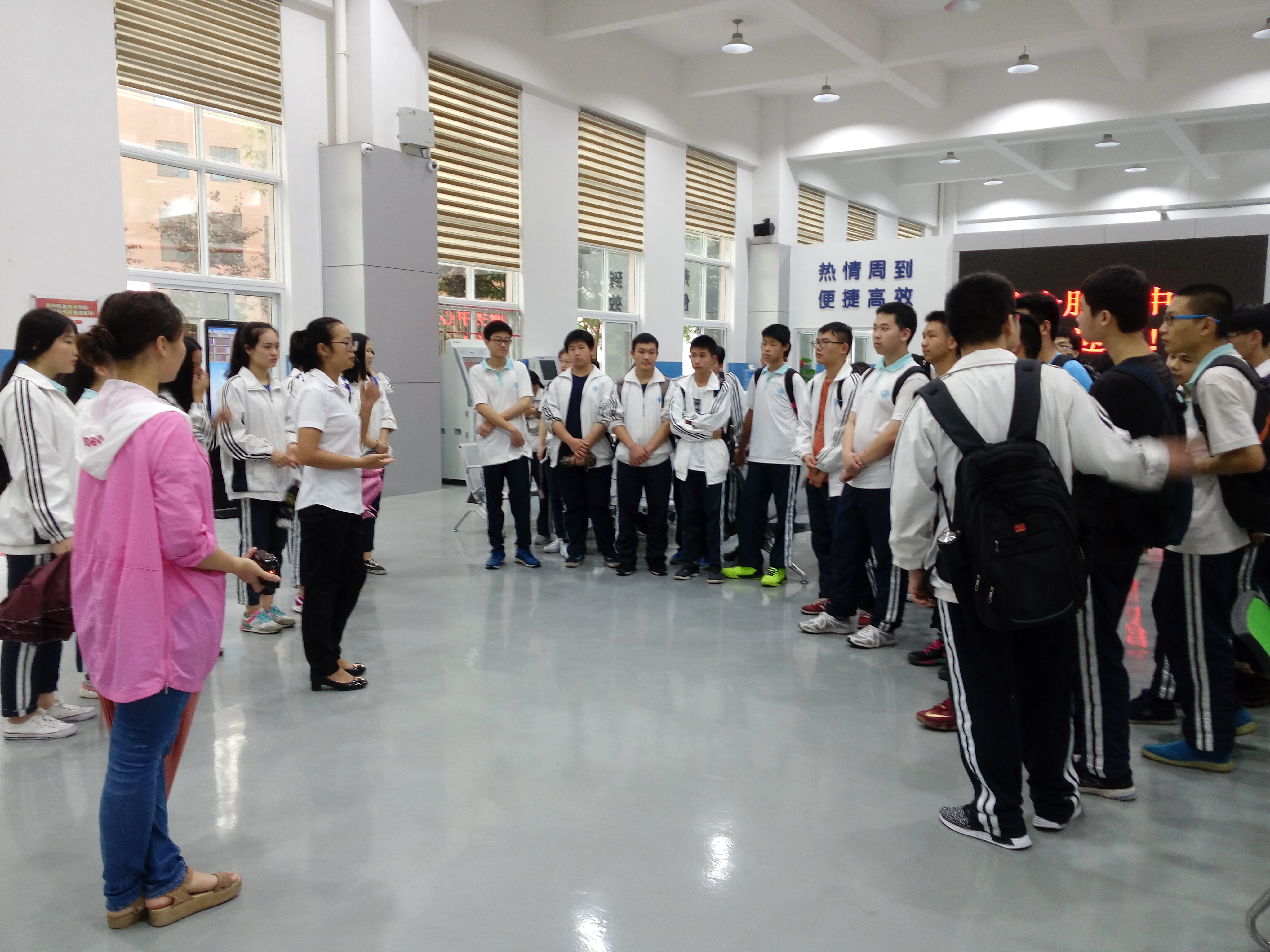 5月19日下午,微微细雨中,载满市六中215名高二年级师生的4辆大巴停在了官塘校区的校门口。师生们先是在校门口拉着“柳州市六中学生职业生涯规划体验活动”和“柳州六中校本课程学生实践活动”的横幅合影留念,然后在志愿者的带领下来到T3D401多媒体教室集合修整,并观看了学校宣传片,从师生们观影的神态和不时响起的掌声看得出来,同学们对我校的各种便利设施和校园风光羡慕不已,并对我校的办学水平和校园文化深深的认同。