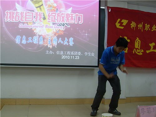 为了给同学们一个展现自我的平台,发掘一批具有主持能力的人才,信息工程系于2010年11月23日晚在博闻楼312教室举办了2010级新生主持人大赛。担任本次大赛评委的有系分团委书记廖菲玲老师、2010级辅导员杨冬燕老师以及系学生会主席黎枫。