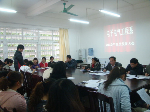 2010年12月9日下午,电子电气工程系党总支部在行健楼电子电气工程系会议室召开了党员发展大会?;嵋橛裳持Р渴榧桥饲炖鲜χ鞒?,电子电气工程系党总支伍柳书记、全体党员以及此次会议发展对象参加了会议。本次大会主要讨论08级和09级共33名同学成为预备党员的问题。