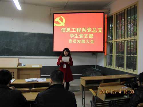 2010年12月14日下午,信息工程系党总支学生党支部在文华楼103教室召开了学生党员发展大会。党总支成员、发展对象以及部分入党积极分子参加了此次大会,会议由学生党支部书记龙思珍主持。大会在庄严的氛围中严格按照党员发展的程序有序进行。