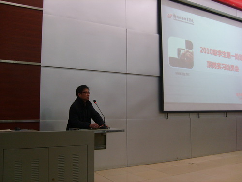 会上,伍柳书记给全体2010级同学讲解了顶岗实习的重要意义,希望全体2010级同学积极参与到顶岗实习的教学活动中。随后,岑方卫副主任从为什么要开展顶岗实习教学活动、第一阶段顶岗实习的教学安排、第一阶段顶岗实习企业的基本情况等方面对顶岗实习进行了全面的介绍,并观看了顶岗实习单位的影像资料,让2010级的同学们更加深入地了解第一阶段顶岗实习教学活动内容及安排。