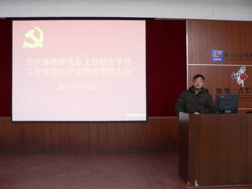2011年1月13日下午,公共基础部党总支部召开创先争优工作领导点评大会。会议由党总支书记姜献生主持,学院创先争优活动领导小组联系点领导、院党委委员熊文华副院长和全体党员教师出席了会议。