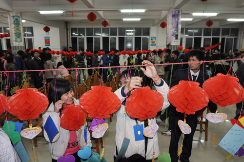 当时装秀在同学们的阵阵掌声中告一段落,迎来了当晚的重头戏——“许愿夜”活动。在会场中,经过工作人员用红色灯笼精心设计许愿长廊上悬挂着来自学院各系女生精心设计的许愿卡。小小精美的卡片上寄托着女生们心中的愿望和期盼,期待自己的卡片能吸引住长廊里的男生摘取,并帮助自己实现愿望。当然,很多男生争着摘取了女生们的许愿卡,甚至连台上的男主持人也忍不住走下舞台,去摘取了一张许愿卡,并马上为卡片上的女生实现了愿望,现场热闹非凡。