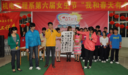 2011年3月11日晚,机电工程系以“我和春天有个约会”为主题的第六届女生节在学院本部鸿讯食堂三楼隆重举行开幕式。学院团委韩霄老师、周虹老师,机电工程系分团委书记覃日娜老师,汽车与环境工程系伍帅老师,以及机电工程系辅导员贾洪峰、唐翠英、韦柳宁和黄曼老师等出席了此次开幕式。