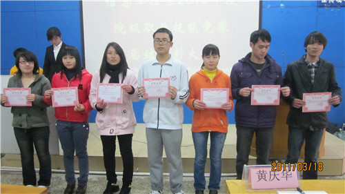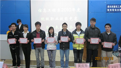 2011年3月18日下午,信息工程系2010年院级职业技能竞赛总结表彰大会在学院本部思贤楼隆重召开,系主任韦小波、副主任王慧、黄庆华、黄光明,全体教职工及各班级获奖学生代表参加了会议。