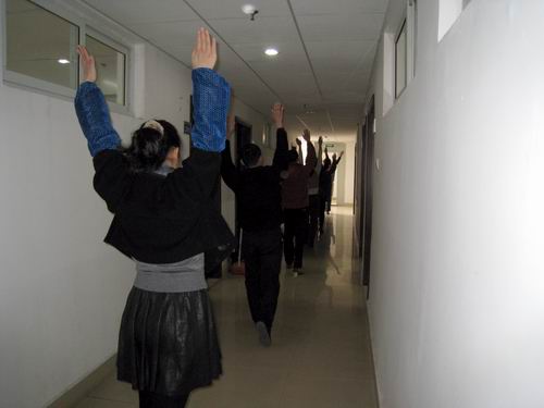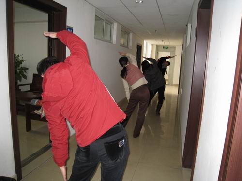 每天10点钟左右,你都能准时听到教务与实训管理处响起广播操的音乐,你都可以看到在办公室外的走廊上,教务处全体教师排成一列做广播体操。自从去年全院运动会教职工体操比赛以来,每天两遍的课间操,已经成为教务处每日必行的一个固定活动。20分钟的课间休息时间,大家从繁忙的工作当中抽身出来,深深胳膊,练练腿,交流交流心情,走廊上时不时传来大家的朗朗笑声,路过的老师有的也会情不自禁地加入锻炼的行列——这就是教务处老师们的课间操时间。