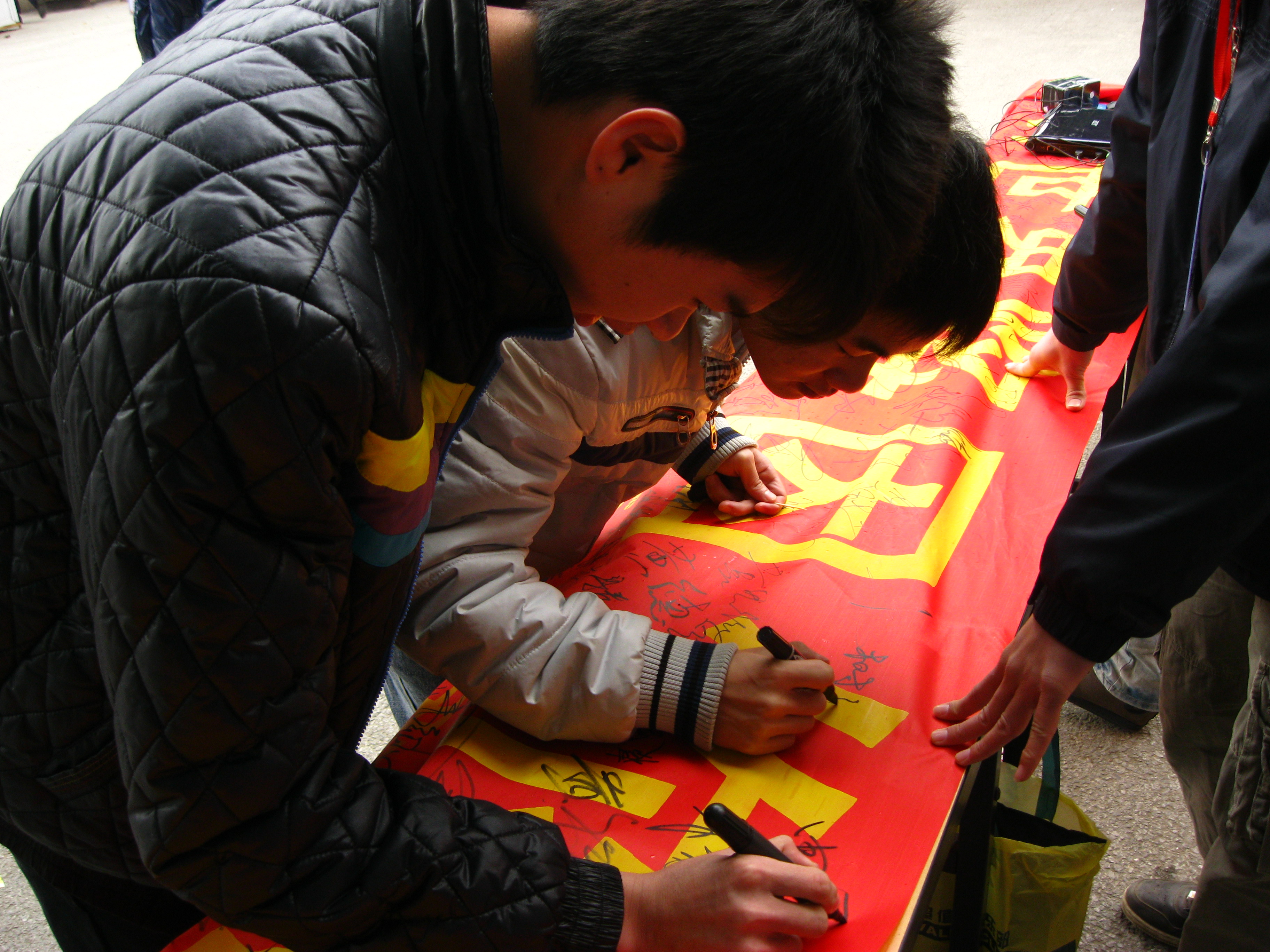同学在横幅签下自己的名字来支持这次活动