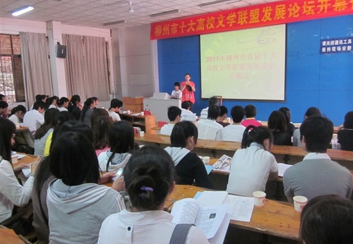为加强柳州市各大高校学生社团的文化交流与合作,提高学生综合素质,充分展示当代青年学生的青春风采,2011年4月23上午,2011年首届“柳州市十大高校文学联盟发展论坛”活动在柳州职业技术学院思贤楼阶梯教室举行。