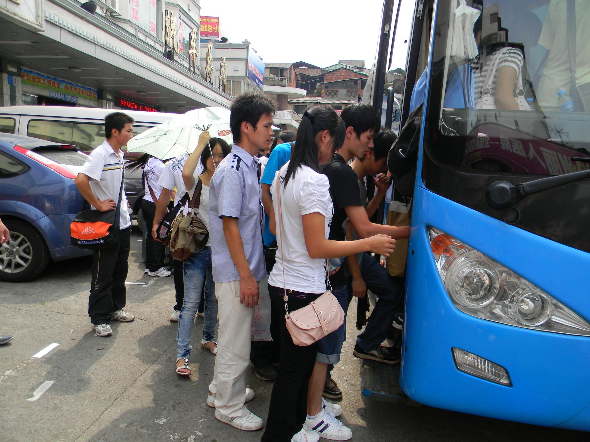 新生们排队上车