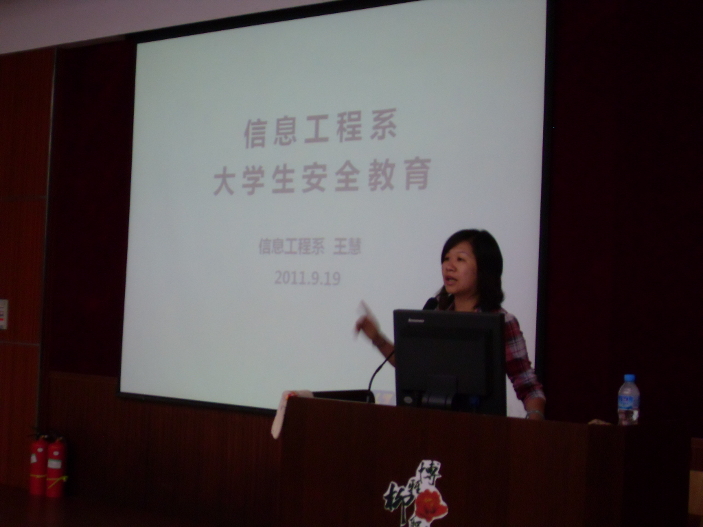 为更好地提高2011级新生的安全意识,构建和谐稳定的校园环境,2011年9月19日下午,信息工程系在德馨楼101教室举行了2011级新生入学教育之安全教育讲座。