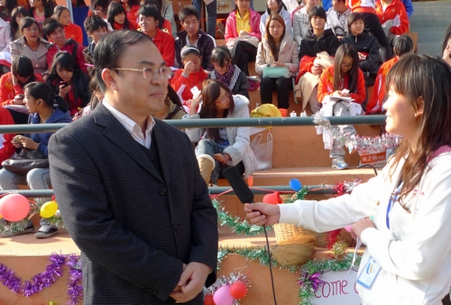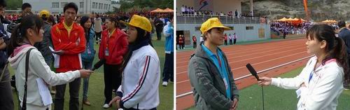 当运动健儿们发挥自身特长,在田径赛场上顽强拼搏时;当拉拉队始终保持热情高涨,为运动员们呐喊助威时;当青年志愿者等相关工作人员在奔波忙碌,为运动会做好保障服务工作时……我们不难发现,赛场上还出现了一道亮丽的风景线,他们就是学院电视台的学生记者,他们深入前线,穿梭于人流当中挖掘亮点,捕捉精彩瞬间,不怕苦、不怕累,随时为老师同学们报道运动会的最新动态。