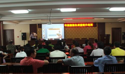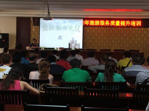 为全面贯彻落实融水县创建“广西优秀旅游县”工作精神,以提高旅游服务质量为目的,通过专题培训的方式,学习先进,交流旅游服务经验,进一步提升旅游从业人员整体素质,提高服务技能水平,促进融水县旅游业又好又快发展,广西融水苗族自治县旅游局于2012年6月25日至27日,在融水大酒店4楼会议室举办了“2012年融水县旅游服务质量提升培训”。来自全县旅游企业安全管理负责人、旅行社导游、景区讲解员、星级饭店客房服务员、总台服务员、前厅大堂服务人员和星级农家乐服务人员共计60名参加了培训。此次培训共分四场,应融水县旅游局的邀请,我院贸易与旅游管理系陈月明和黄影老师承担了培训工作。此次培训结合融水县旅游业发展状况及此次参加培训人员职业实际情况,采用“行动导向教学法”、“微格教学法”、案例进行培训。