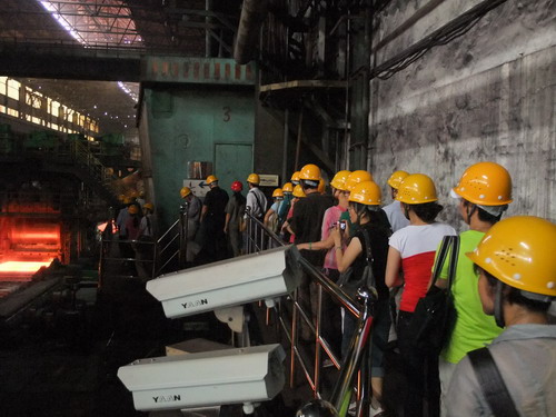 当天下午,大家参观了柳钢集团中板厂和轧钢厂。气势恢弘的车间生产场景和工人们忘我的工作精神给参观教师带来极大的视觉和心灵震撼。车间里火红的板材在滚轮上来回穿梭,冷却钢材过程产生的滋滋声和蒸腾而起的气化雾构成了具有强烈视听冲击的背景,工人们身穿着厚厚的防护服在高温下工作。生产线上,高温钢材火红的映衬出钢铁工人们坚毅的脸庞,令老师们无不为之动容。参观过程中,老师们从各自专业的角度与工厂管理人员交流了企业需要什么样的素质人才以及企业文化如何融入基础课教学之中等问题。