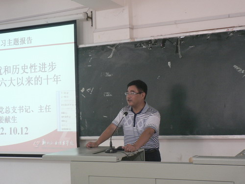 10月12日下午,公共基础部在博文楼311教室召开政治理论学习大会,该部党总支书记、主任姜献生主讲。