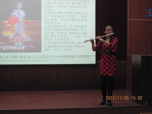 在这场题为“长笛,让心灵飞翔的音乐精灵 ”的讲座中,刘滔老师结合实物介绍了长笛的外形、材质、发声原理以及音色特点,使同学们对这一器身轻盈、音色清脆明亮、纯朴柔和、温婉素雅的乐器有了较清晰的认识。刘滔老师还从长笛演化的五个历史时期入手,详细介绍了长笛的演变和发展过程。在比较西洋长笛与中国竹笛以及单簧管的特点之后,刘滔老师为听众演奏了两支家喻户晓的中国音乐作品《梁?!?和《茉莉花》 ,刘滔老师用她抒情、柔美、干练的演奏风格把这两支音乐的优美旋律展现得淋漓尽致,赢得了“满堂彩”。最后,讲座以我院女子长笛乐坊演奏的《映山红》 和《花儿为什么这样红》落下帷幕。