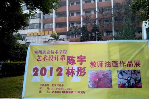 为丰富校园文化生活,加强学院文化艺术氛围,进一步推进学校文化活动的蓬勃发展,活跃学习气氛, 2012年12月5日-15日在柳州职业技术学院艺术设计系综合展览厅举办我院艺术设计系林彤、陈宇教师油画展。本次展览由我院艺术设计系主办,主要展示两位老师近年来创作的油画作品,既有实验性的初探和尝试,亦有率真即兴的戏玩。参展作品画风各异,有的画作来自于既定的基调、偶发的效果、理性和即兴之间的不同流露,陈宇老师的《无题系列》的画作运用非写实的手法增强画面的张力和趣味性,林彤的《阳朔写生系列》画面雅致,展现了生活中美好的画面;从参展的作品看,无论是写实还是抽象,无论是表现还是象征,大多都具有自己的风格面貌,每个画家都力求从自身出发找到自己的视角、发展出自己的个性语言。参展作品广受好评。