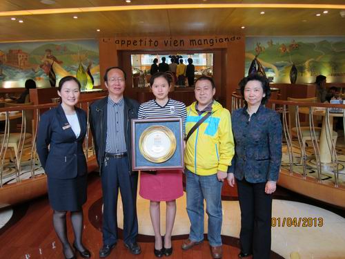 在上海威斯汀大饭店与2011级酒店管理专业毕业生莫金花(中间)合影