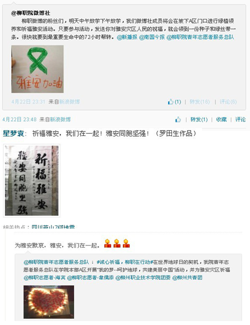 据了解,在此次四川地震发生后,我院部分学生会、学生社团、学生团体都在各自官方微博上自觉发起网络祈?;疃?,部分学生团体除了自发发起祝福、祈?;疃?,还纷纷转发国内各媒体的灾情及救援报道,越来越多的同学陆续参与到了网络互动中。
