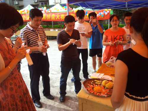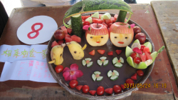 各组参赛选手根据自己所选的水果进行构思、雕刻和拼接,用最小的水果成本,发挥各自独特的想象力,同时协调团队合作能力,在时间、空间的限制条件下,创作出一盘盘生动、特色的佳作。各组代表对作品进行解说时,有的与“中国梦”联系起来,有的与神话传说联系起来,有的与梦和感恩联系在一起,有的与同学们之间的友谊紧密联系,都得到了评委的一致好评。此次比赛在该系同学们及各系部代表的积极配合下得以成功举办。