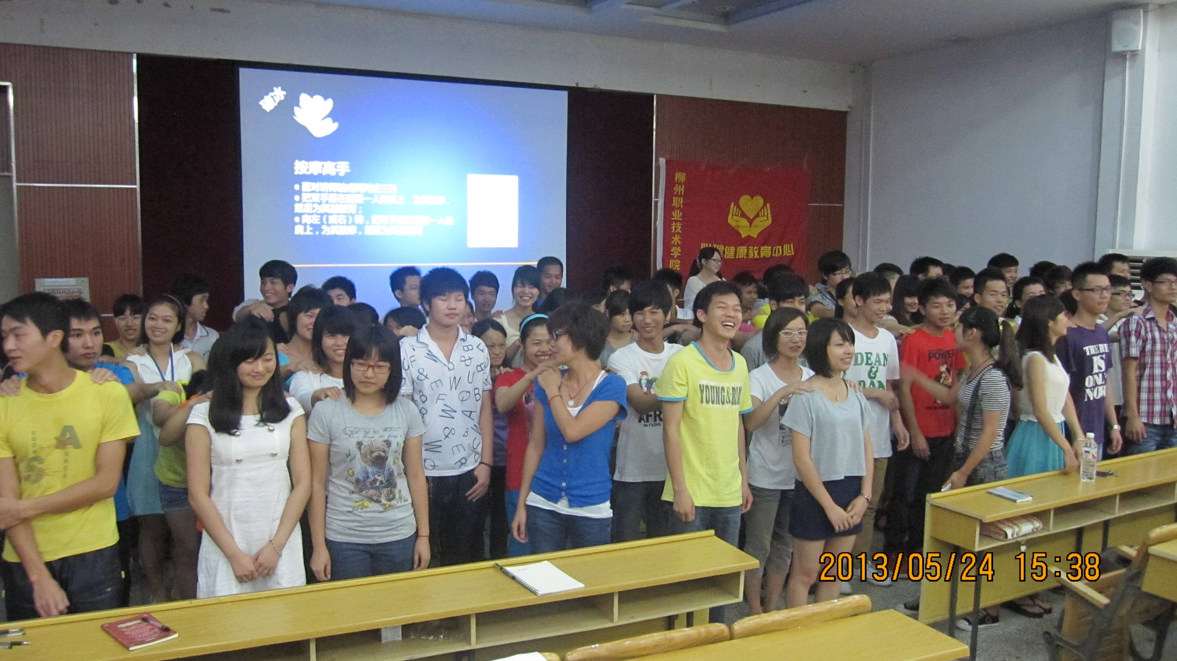 左妮红教授的讲座以破冰游戏——“按摩高手”为切入点。通过左妮红教授的指令,与会听众分为五排站在讲台前,他们分别朝四个方向为身边的同学按摩肩膀。大家一面按摩,一面关切地询问对方的感受。教室顿时热闹了起来,问候声、笑声、鼓掌声汇聚成欢乐的海洋。破冰游戏之后,左妮红教授总结说:一个人是否幸福不取决于外在因素的好坏,而取决于个人心态是否积极向上。如果大家都以快乐积极的心态参与到活动当中,就会感受到活动的快乐。