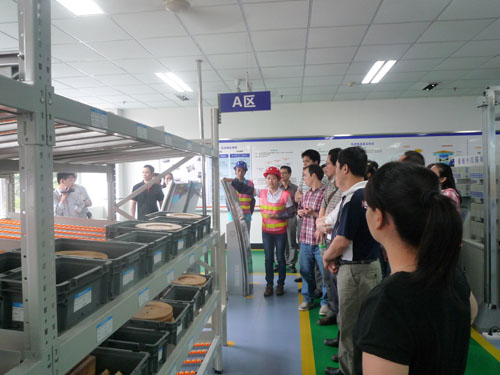 培训师带领大家到模拟工厂生产线的各个区域边参观边介绍,在各组教练的指导下,大家穿戴好劳保用品,一个个活脱脱“一线工人”的模样走上各自的工作岗位,熟悉操作流程、暗灯系统、工位看板、FPS点、工位料架等,并正式开始第一次模拟走线。