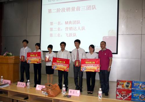 接下来是大会最激动人心的环节,唐平章队长宣布大赛两个阶段分别取得销量前三名的团队,以及娃哈哈优秀学员助学金获得者名单,获奖团队和个人在激动人心的音乐声中上台领奖,娃哈哈优秀学员助学金获得者更获得每人5000元的奖励。何志忠副主任(主持工作)宣布优秀团队、优秀销售员和优秀仓管的获奖者名单,并为获奖团队和个人颁奖。