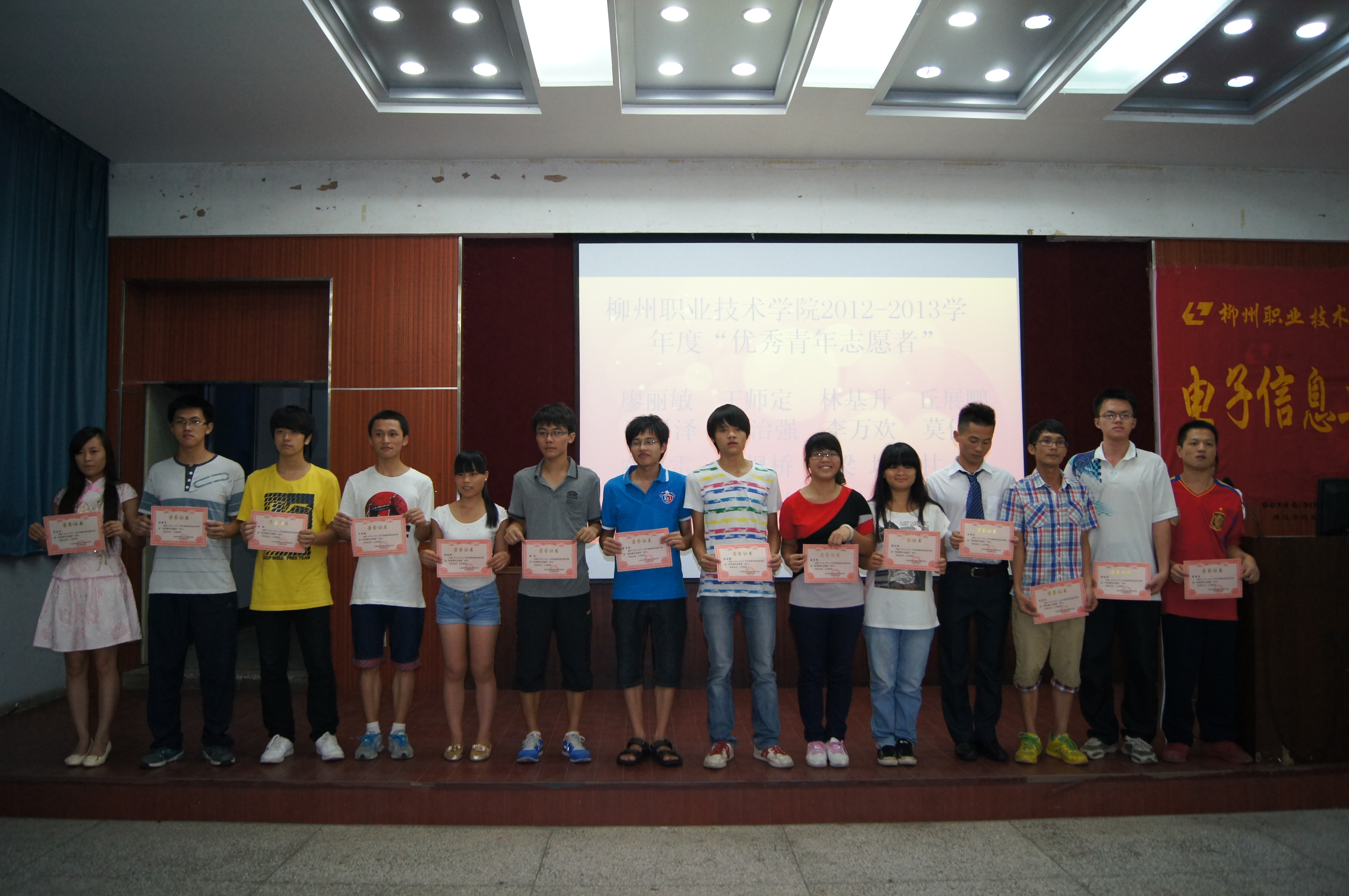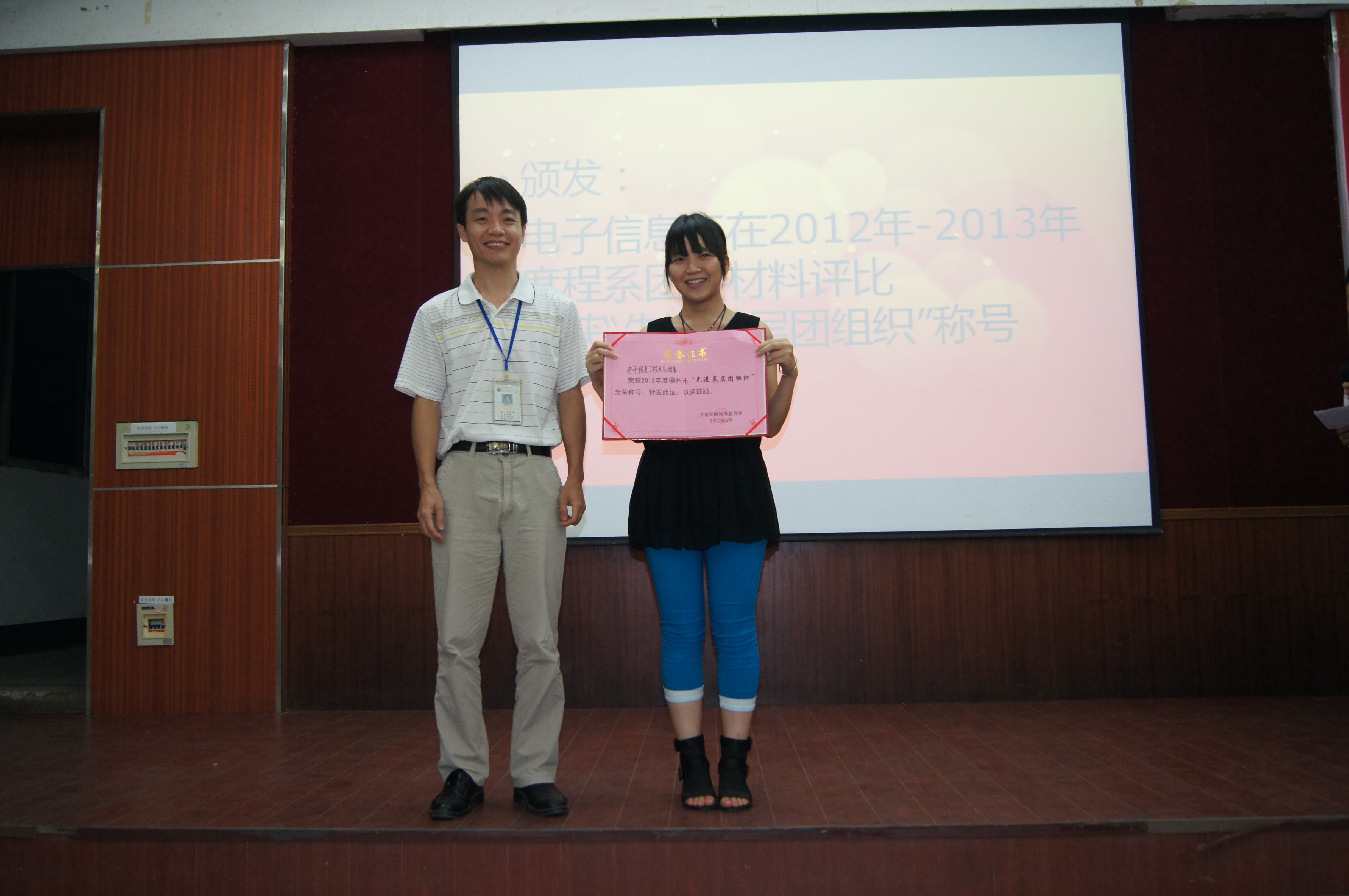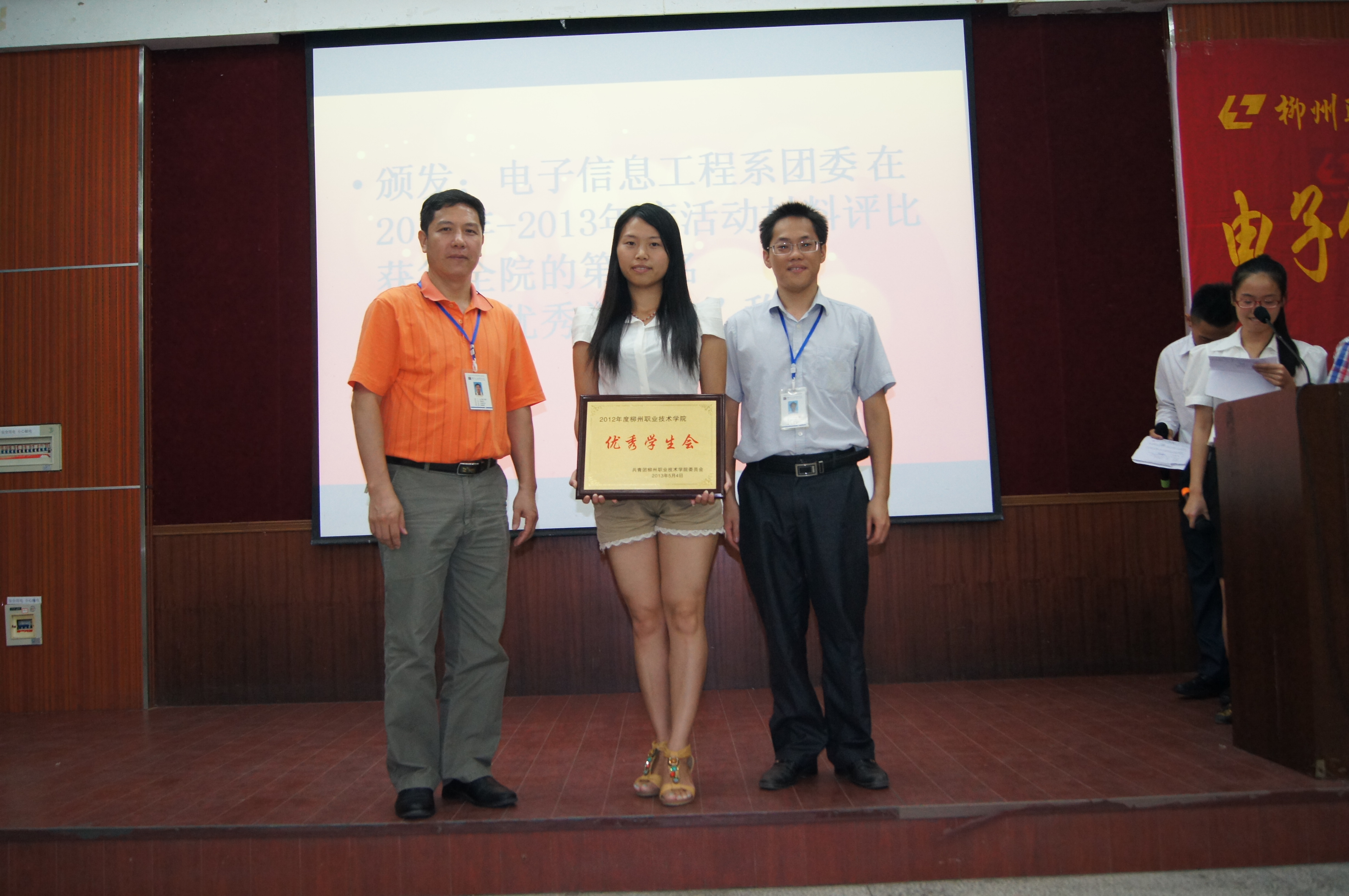 主持人宣读了表彰电子信息工程系2012-2013学年度先进班集体、柳州市 “三好学生”、“优秀团干”、“优秀团员”、“优秀学生干部”,学院“优秀团干”、“优秀团员”、“优秀青年志愿者”,电子信息工程系团委学生会 “优秀委员”、“优秀干事”和“积极分子”,学生会“先进部门”、“优秀部门”以及学院“优秀学生会”、柳州市“先进基层团组织”、“学院青年志愿者服务优秀集体”以及安全文明宿舍等奖项的决定,该系领导对获得以上奖项的个人和集体进行了表彰并颁发荣誉证书。表彰大会在师生们热烈的掌声中落下了帷幕。