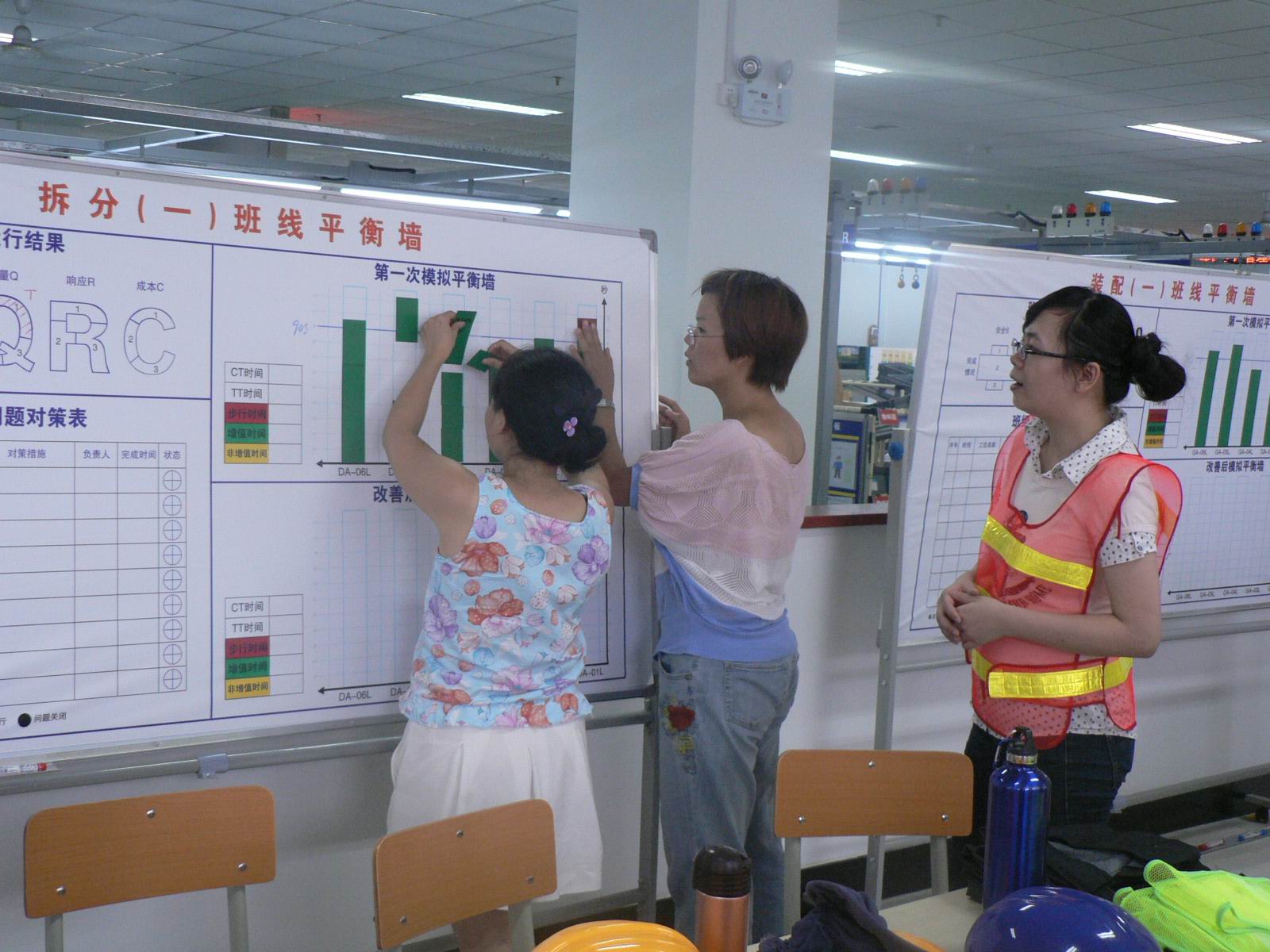 在第二次走线过程中,各小组按照重新确定的工序和操作标准进行生产,生产秩序井然,“工人们”忙而不乱,现场中很少出现第一次走线过程中那些杂乱的声音。第二次走线结束后再次进行了工作研讨。总教练总结说,本轮走线各小组各方面生产指标都得到了明显提高,但仍有多项生产未能达标,有待完善和提高。各组代表与大家分享了自己岗位生产的感受和成功的经验,分析了本组生产中存在的问题,并提出改进意见。