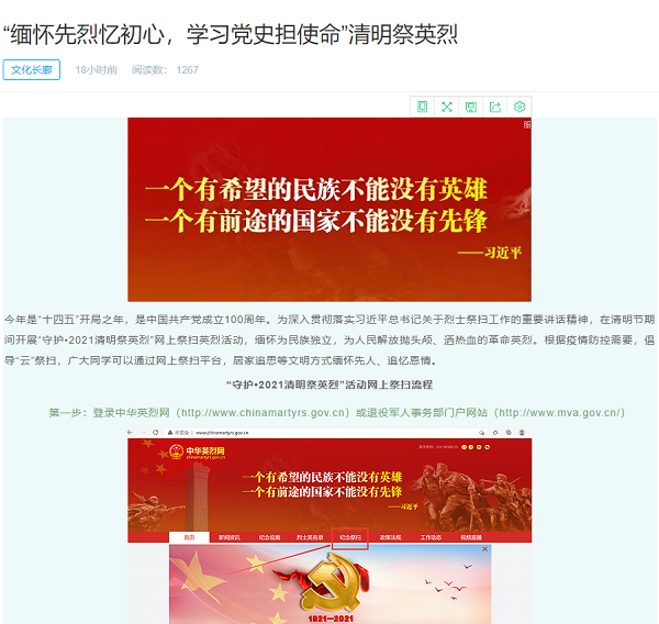 汽车工程学院倡导“云”祭扫,呼吁广大师生通过网上祭扫平台、居家追思,以文明方式缅怀先人、追忆恩情,易班工作站也上线了“缅怀先烈忆初心 学习党史担使命”推文,包含有线上祭扫英烈活动的详细流程。该院学生积极参与,通过在网上献花致敬、寄语留言表达对革命烈士的深切哀思。