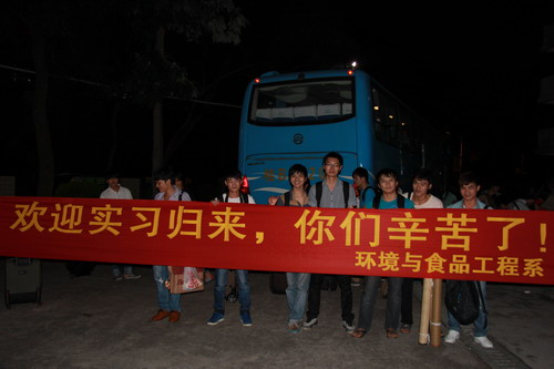 2013年9月28日傍晚,三辆满载学生的大客车停在女生宿舍睿智圆大门前,这是环境与食品工程系2012级学生赴东莞徐记食品公司实习胜利归来。该系师生打着欢迎的横幅,迎接同学们的归来。虽经长途跋涉,但同学们仍是精神抖擞,异常兴奋,像久归的孩子回到了温暖的家。