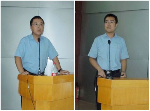 湛江钢铁宣传部部长高银波(左)和人力资源部招聘主管潘庆(右)介绍企业情况