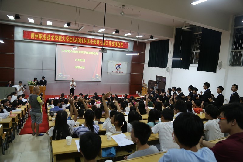 2013年10月9日,我院大学生KAB创业俱乐部举行了第七届理事会交接仪式,新任理事们郑重地接下了会旗,勇敢地扛下了发展俱乐部的责任和使命,“励志照亮人生,创业成就未来”的口号,诠释着新一届理事的决心和信念。学院学生工作处处长唐冬雷、招生就业处处长黄莉、公共基础部主任姜献生、副主任陈芳、李革以及社团指导老师公共基础部就业与创业教学团队负责人许明教授、柳州市大学生创业园代表、学院社团联合会创业联盟代表出席交接仪式。