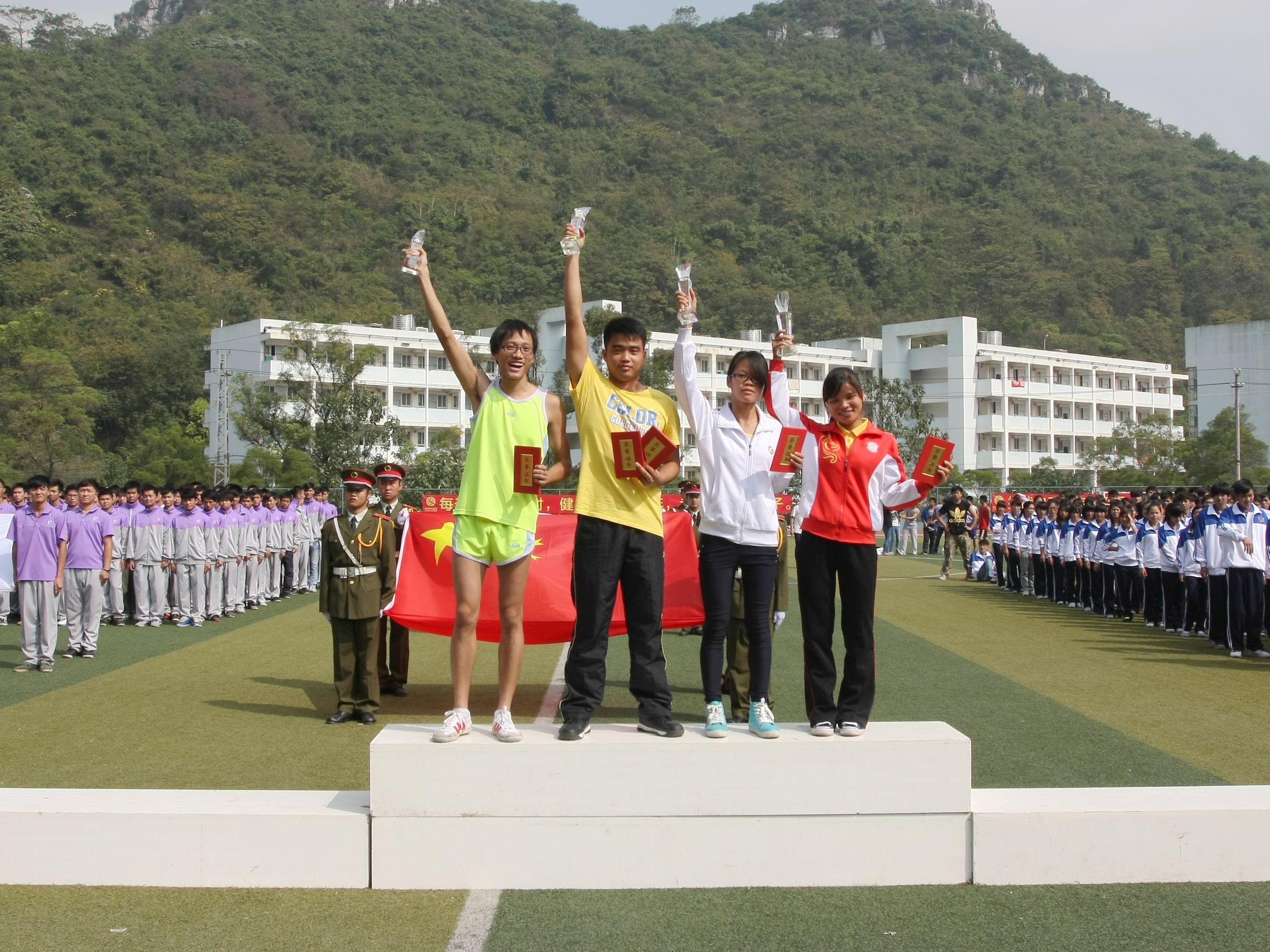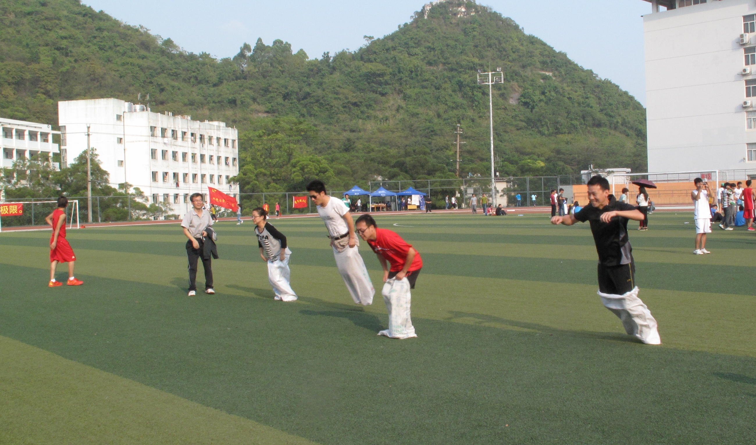 国旗下,小伙伴们在奋力地投掷着决定最后成绩的铅球,一咬牙、一跺脚,铅球从手中飞奔而去,距离却又比先前又投远了一点;跳高比赛在田径场上默默地进行着,不为赢得掌声,也不为刻意的征服,一次次地腾跃而上,一条条优美的弧线就是为了证明:我来过,我经历过,无论胜利抑或失败,经历是人生中最宝贵的财富!在4*400米女子接力跑中,电子信息系的一名选手不慎摔倒了,但她仍在老师和同学们的搀扶下,一腐一拐地把接力捧跑着交给下一位接力的同学,在此,同学们看到的是一个坚强的信念在支撑着她:团队的荣誉重于个人的得失,比赛绝不因体力不支而中断!
