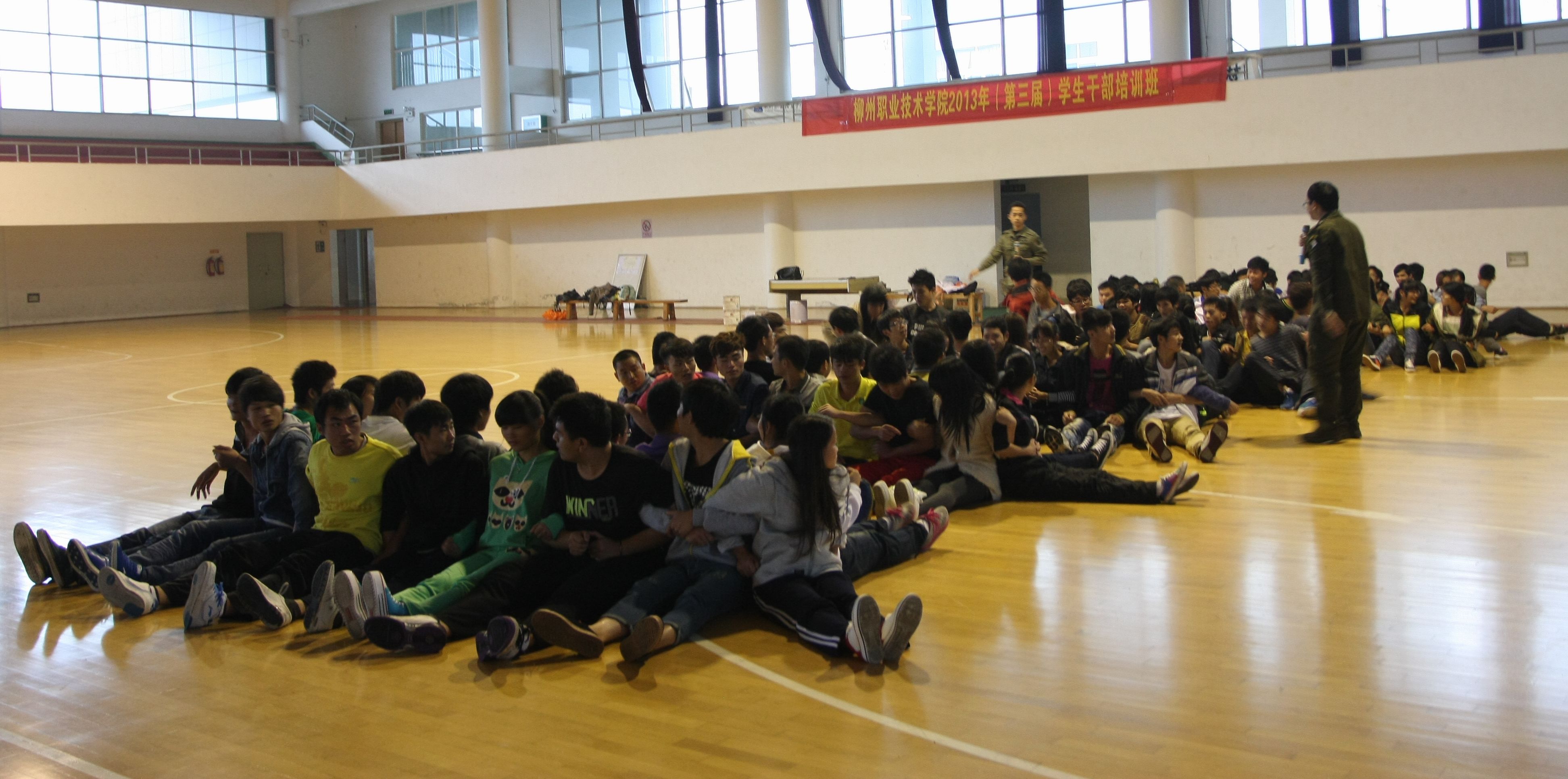 下午,全体学员分别在学院体育馆四楼和田径场开展了以培养团队凝聚力和领导力为主要目的的素质拓展训练,专业教练来自柳州市拓海素质训练基地的教学团队。队员们被分成4个风、云、雷、电4小分队,在两位专业教练的带领下共同完成10个训练项目?;疃?,各小分队即兴创作和展示独具特色的团队文化,学员们服从指挥,密切合作,群策群力,共同闯过一个又一个难关。尤其在最后的项目“穿越电网”时,同学们一次又一次地触网、受罚、重来……虽然已是晚上7点多钟,天完全黑了,队员们相互鼓励,勇于担当,没有一个同学放弃、灰心、掉队。最后,在田径场上,每个同学发自肺腑地用一句话说出了自己的体会和收获,全体同学动容地大声喊出感谢父母、感谢队友、感谢学校!声音在宁静的的夜空上盘旋、回荡。