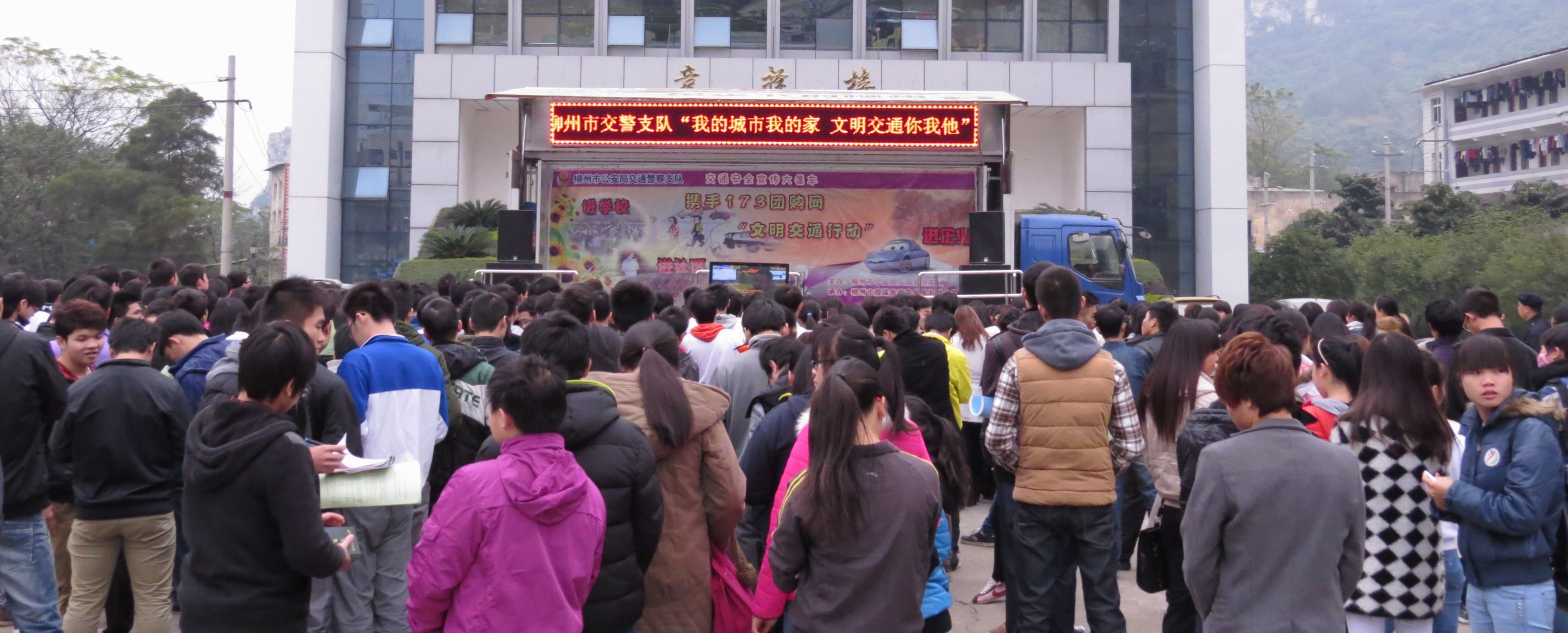 “这是禁止通行的标志吗?”主持人站在舞台上问同学们。“不是,是限速标志?!碧ㄏ碌耐蔷偈智来?,答对的同学得到了交警为他们准备的精美礼物——12月11日下午,我院学生工作处邀请柳州市公安局交警支队交通安全宣传大篷车开进校园,用寓教于乐的方式和学生们喜闻乐见的形式开展交通安全教育活动,我院近500名师生在竞择楼前参加了此次活动。