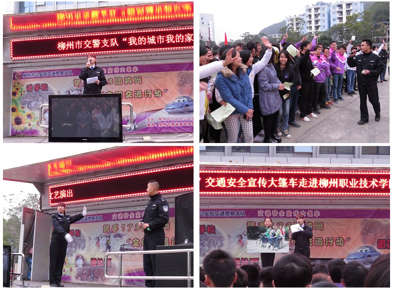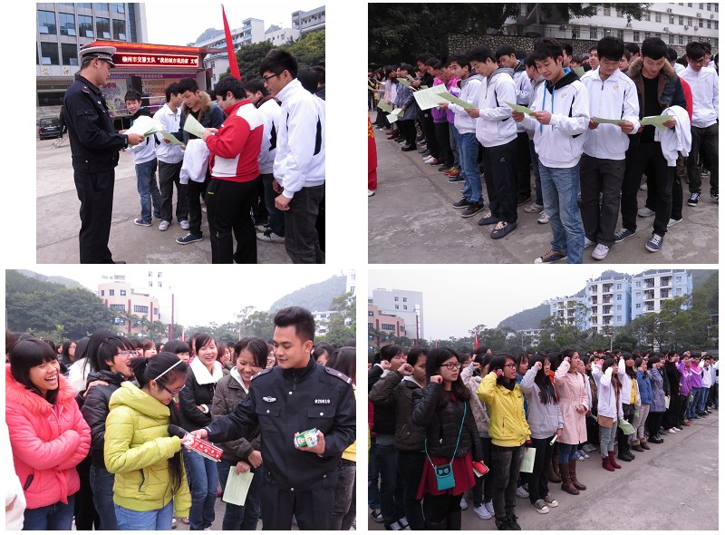 我院坐落在柳州市区内,学生人数过万且多为年轻人,对这样一个庞大的交通参与群体进行交通安全宣传教育很有必要。针对我院学生乘电动车出入学校的人数较多这一情况,交警支队的干警们首先给同学们发放了关于电动车安全文明驾驶的宣传单,播放了近年来发生在我市的与电动车相关的交通事故及应对措施的宣传视频。交警们还在现场通过形式多样的方式宣传教育法规知识,吸引大批学生参加。