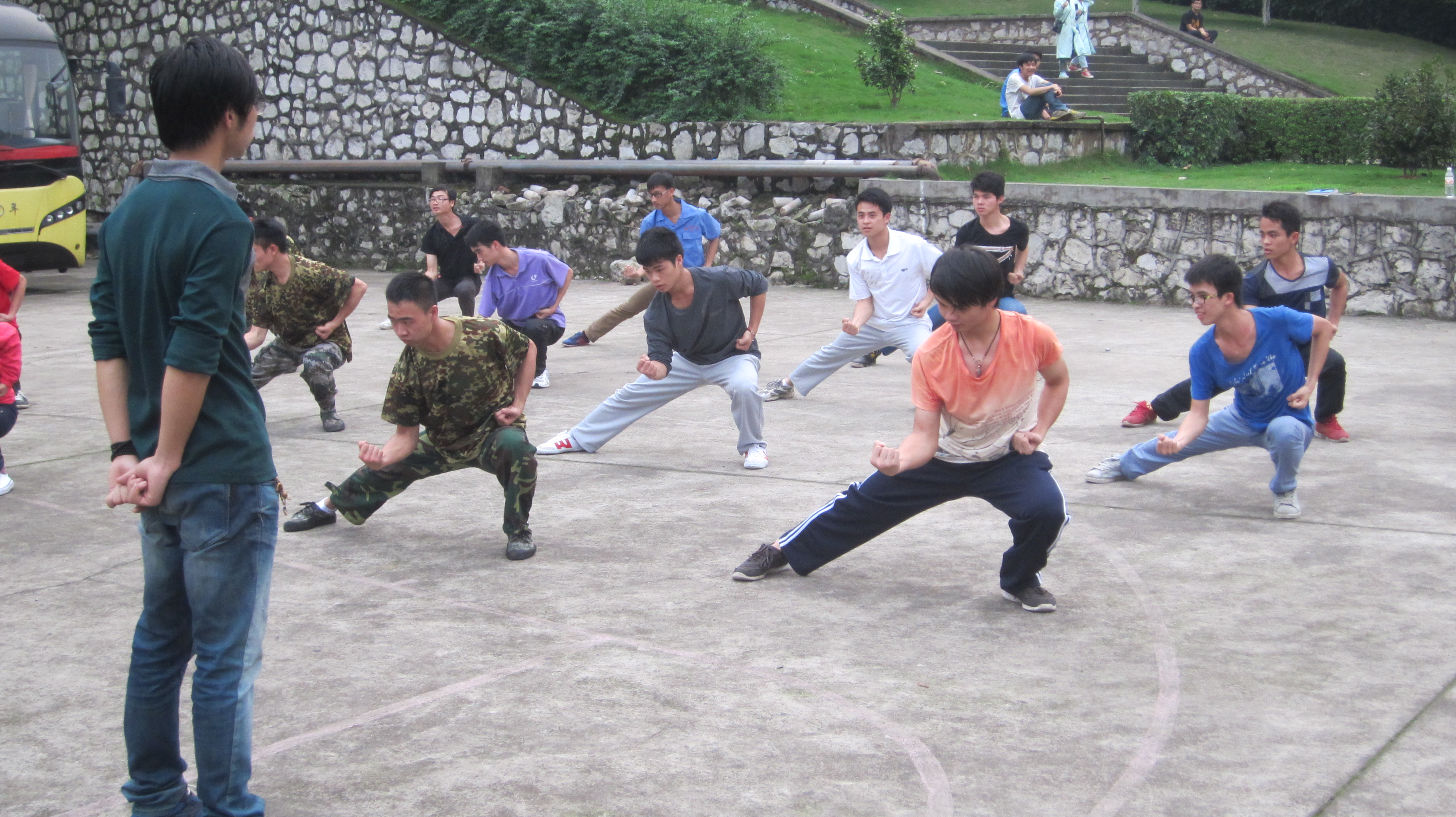 作为现场唯一一个由学生团体自发组合的节目,《中华武术》很好地将我院武术协会、院国旗班、校卫队的校园文化宗旨生动鲜活的表达。刚柔并济、强身健体正是此节目要传递的中华武术精髓,而这35个表演者中,近半是没有太极和军体拳的训练功底的,他们仅仅通过3周集训就完成了2套拳法的学习。节目的前半段是以太极拳为主的柔缓,后半段则是以军体拳为主的刚劲,有歌曰:“刚在先兮柔腰与手,我则吸腰步稳扬?!闭獗闶侵谢涫醯木可斫√?,保家卫国。