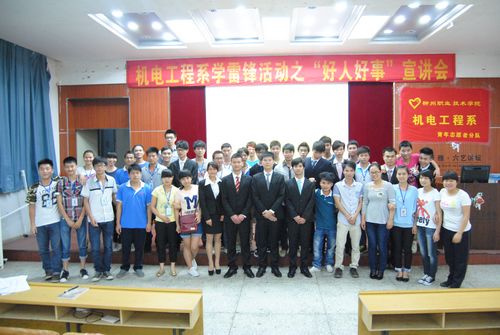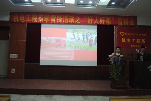 当三月学雷锋活动在各高校进行得如火如荼之时,我院机电工程系团委也启动了学雷锋系列活动,活动之一的“好人好事”宣讲会,于2014年5月15日晚在德馨楼101教室举行。该系团委书记莫丽娜老师、辅导员韦伟老师、周振煜老师以及各学生社团代表、该系2012级和2013级各班级代表近130人参加。